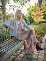 Denne strikcardigan er et perfekt eksempel på tidløs elegance og komfort. Den strikkede cardigan er fremstillet i Italien hos en af vores mangeårige partnere, hvilket sikrer den højeste kvalitet og opmærksomhed på detaljer. Cardiganen har et klassisk design med fine, guldfarvede knapper og praktiske lommer, som tilføjer et strejf af sofistikeret charme. Den er ideel til både hverdag og festlige lejligheder, og dens alsidige udtryk gør den let at style til ethvert outfit. Lad denne strikcardigan blive et uundværligt stykke i din garderobe.